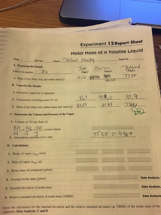 | Read Experiment 12 Report S Molar Mass Of A Volatile Chegg |